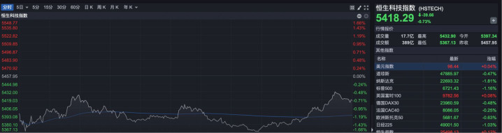 由于科网股表现乏力,恒生科技指数依旧收跌。截至收盘,恒生科技指数收报5418.29点,下跌39.66点,跌幅0.73%。